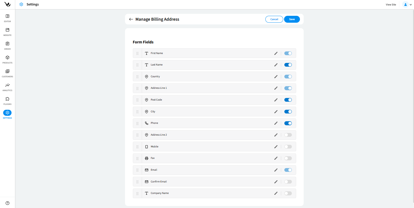 Edit and Delete Custom Field: Allows you to modify or remove custom fields for billing address. - Manage Text: Enables editing the text displayed for billing fields.