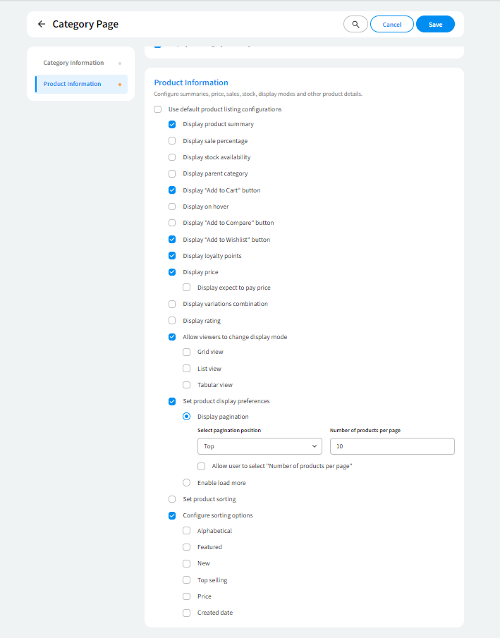 - Configure options for sorting, display mode, and preferences for how customers view products.