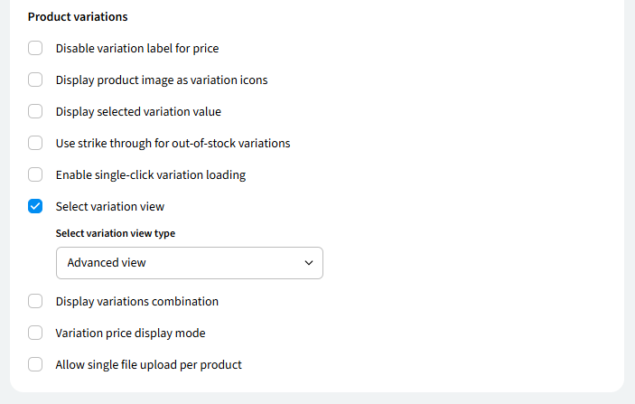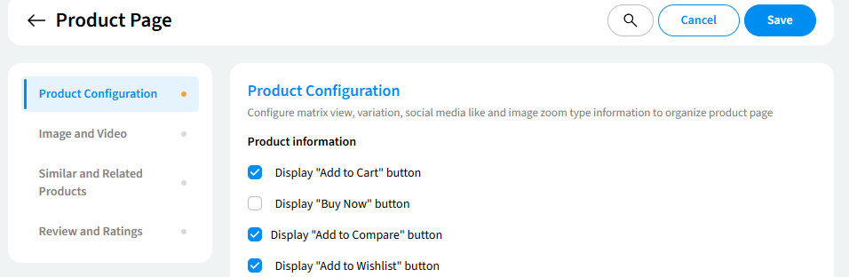- Navigate to the "Product Configuration" section of your product page settings. Here, you can enable or disable various features like matrix view, variations, social media sharing, and image zoom.